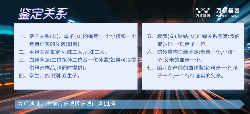 宁德亲子鉴定办理地址:宁德市蕉城区蕉城南路11号(如需办理,需提前预约)预约电话:4001789498,服务地区包括:蕉城区、霞浦县、古田县、屏南县、寿宁县、周宁县、柘荣县、福安市、福鼎市等宁德周边地区,宁德亲子鉴定基因检测的服务范围涵盖了广义的亲子鉴定、DNA验证、亲子鉴定证明等等。